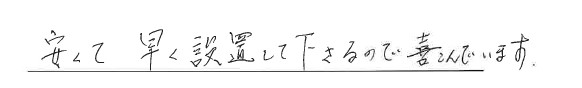 工事担当者の方も感じが良く、手際も良かったので御社で購入して大変良かったです。